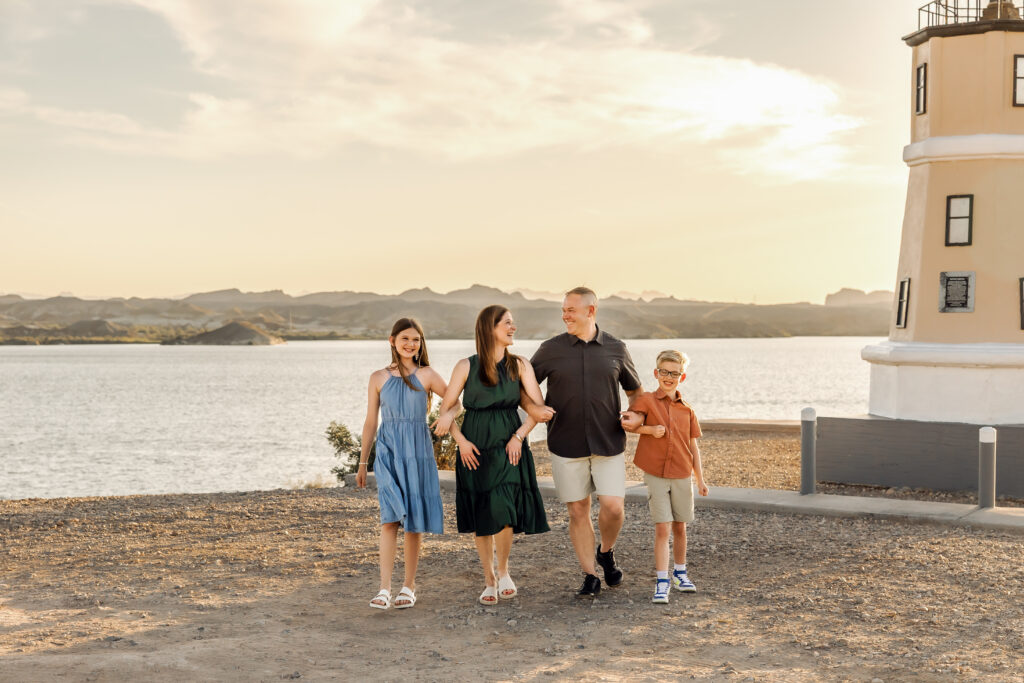 I love photographing families at Windsor Beach at Lake Havasu State Park. Windsor Beach offers scenic shoreline views of Lake Havasu,  with stunning sunset views  from the beach. There are also two lighthouses, one of Lake Havasu well known landmarks,  that make for beautiful photo opportunities. Nearby, there is an adorable cactus garden not far from the beach.